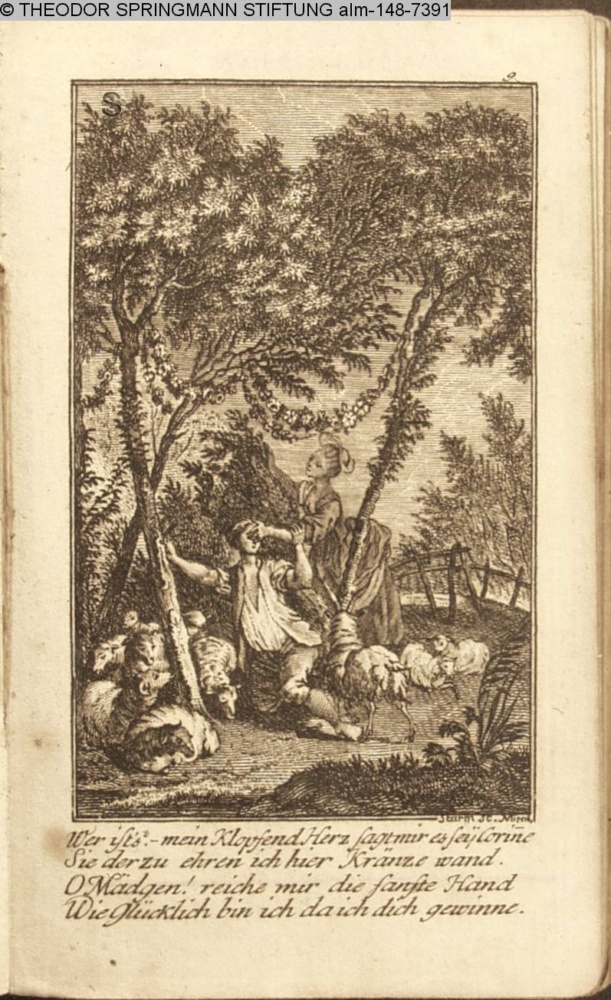 Wer ist's? mein Klopfend Herz sagt mir es sey Corinne / Sie der zu ehren ich hier Kränze wand. / O Mädgen! reiche mir die sanfte Hand / Wie Glücklich bin ich da ich dich gewinne.