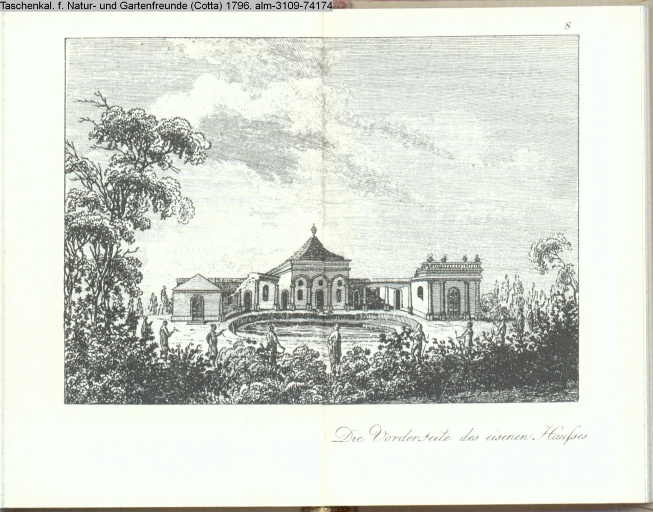 Illustration zu »Beschreibung des Gartens in Hohenheim. Fortsetzung. / Das eisene Haus. / VorderSeite desselben« von G. H. Rapp INr 74173, Obj 23