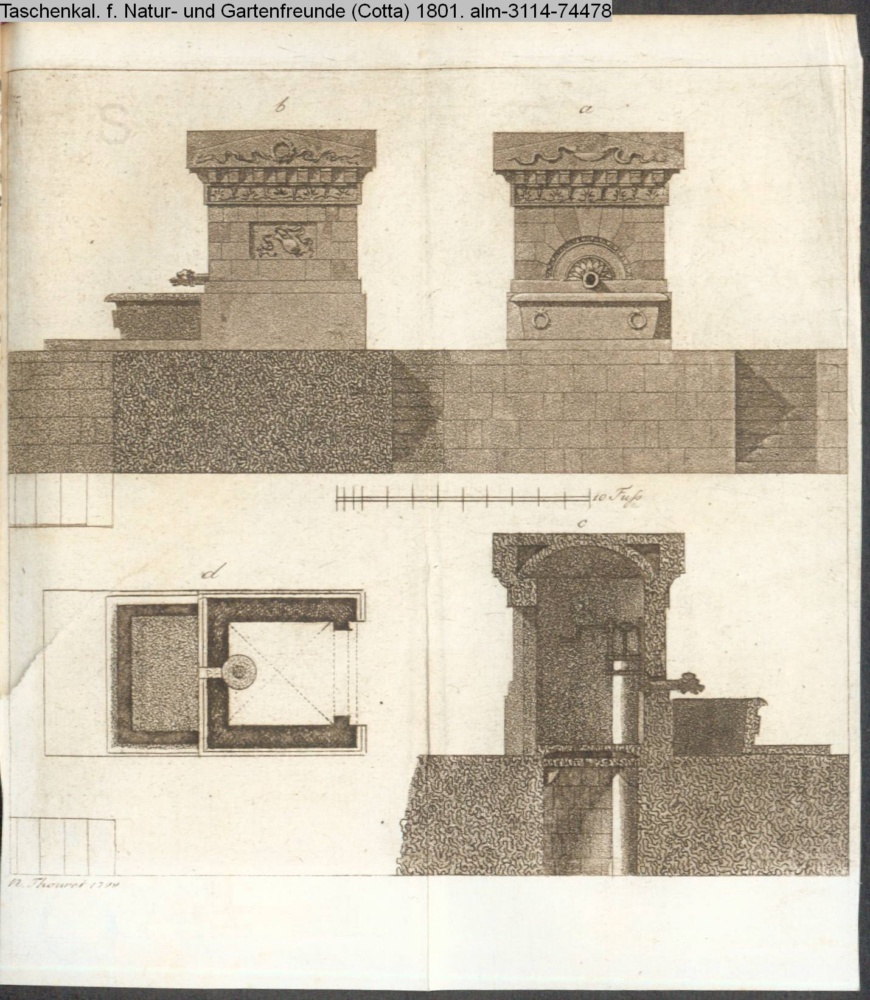 Illustration zu »Einige Vorschläge von Herrn Hofarchitect Thouret. 1) Der Eingang zu einem Park. 2.) Bekleidung einer Wasserpumpe«
