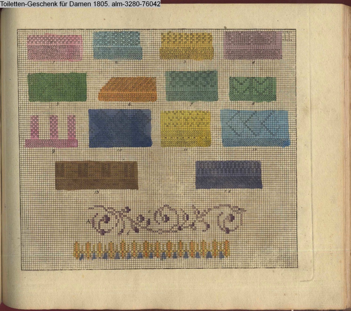 kol. graphische Stickanleitung. Beigabe zu »Das sammetähnliche Stricken« von Netto INr 76040, Obj 52 und »Von durchbrochener Stickerei« von Netto INr 76041, Obj 53