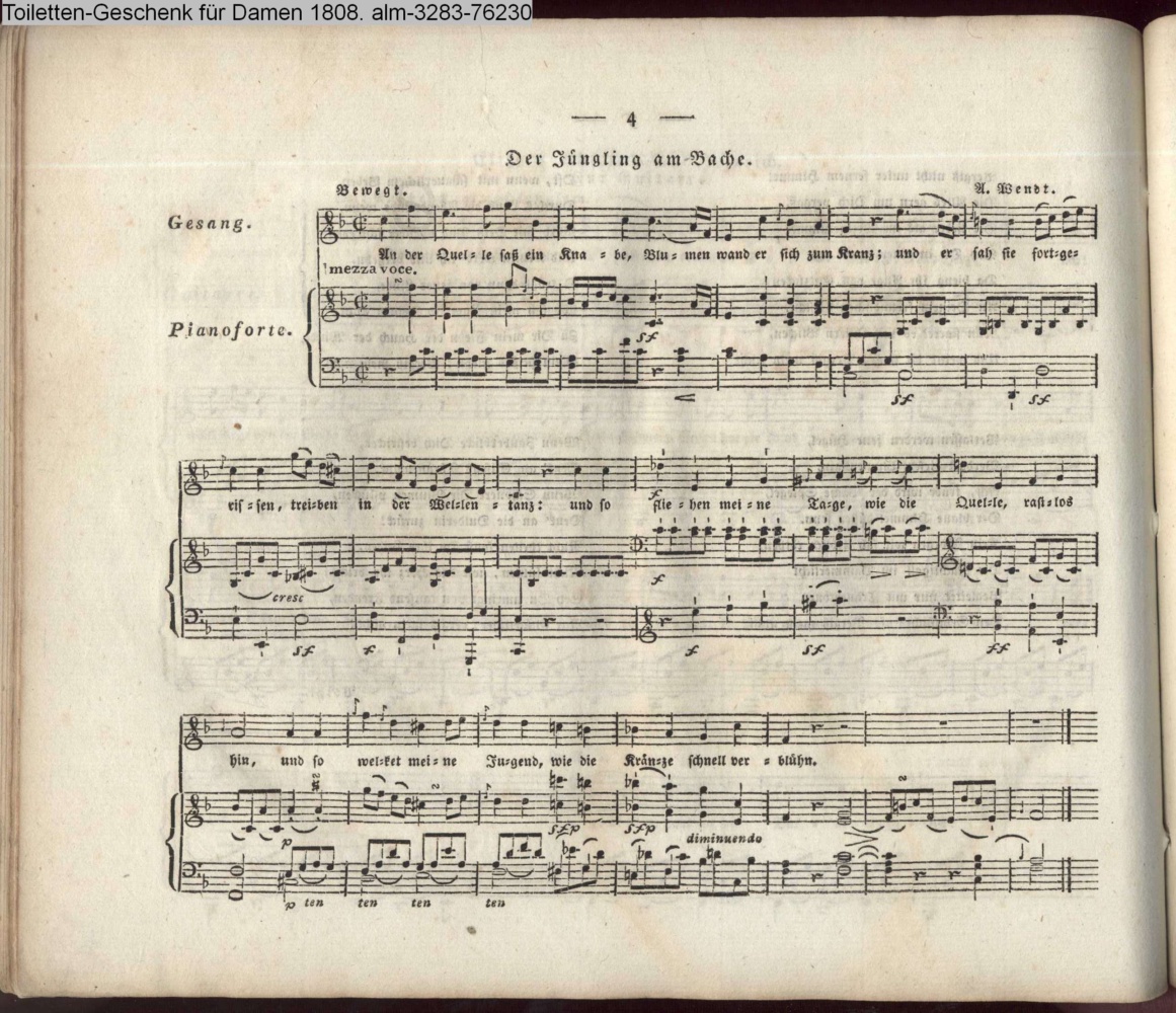 An der Quelle saß ein Knabe, Blumen wand er sich zum Kranz und er sah sie fortgerissen, treiben in der Wellen Tanz;…