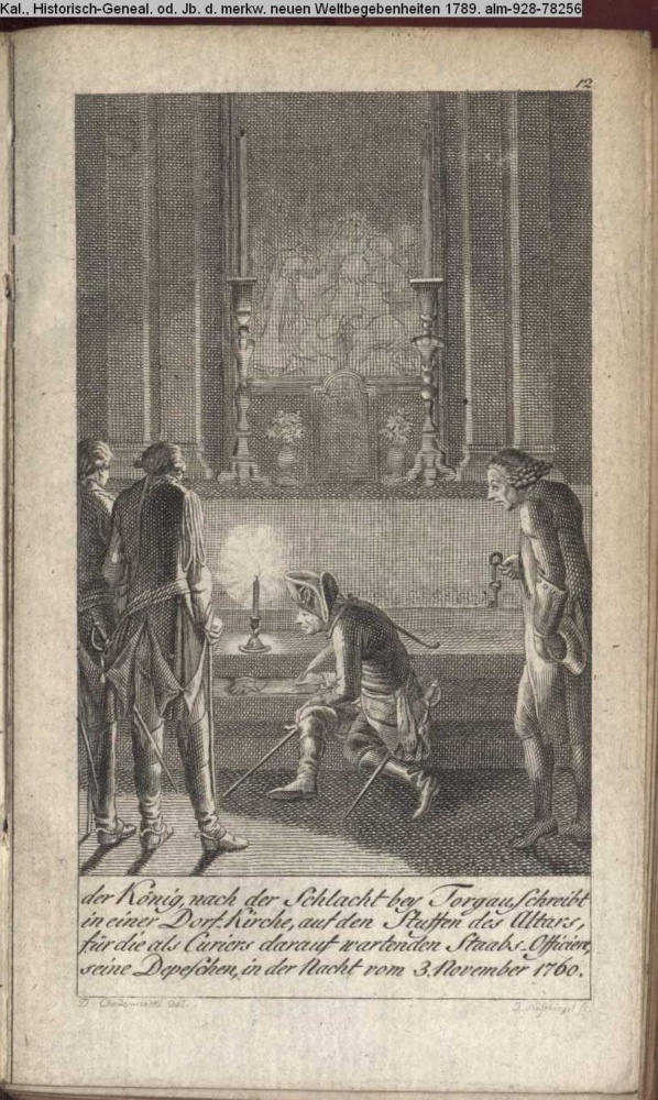 der König nach der Schlacht bey Torgau, schreibt / in einer Dorf-Kirche, auf den Stufen des Altars, / für die als Curiers darauf wartenden Staabs-Officiere, / seine Depeschen, in der Nacht vom 3. November 1760