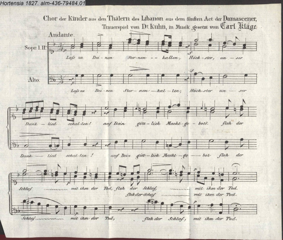 Chor der Kinder aus den Thälern des Libanon aus dem fünften Act der Damascener, / Trauerspiel von Dr. Kuhn, in Musik gesetzt von Carl Klage