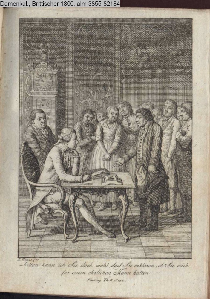 bitten kann ich Sie doch wohl, dass Sie erklären, ob Sie mich / für einen ehrlichen Mann halten. / Flaming. Th. II. S. 200