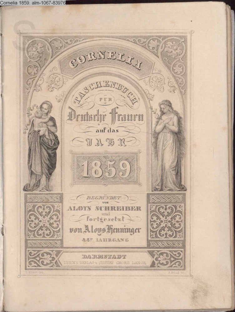 CORNELIA / TASCHENBUCH / FÜR / Deutsche Frauen / auf das / JAHR / 1859 / BEGRÜNDET / VON / ALOYS SCHREIBER / und / fortgesetzt / von Aloys Henninger / 44r JAHRGANG / DARMSTADT / DRUCK & VERLAG v. GUSTAV GEORG LANGE