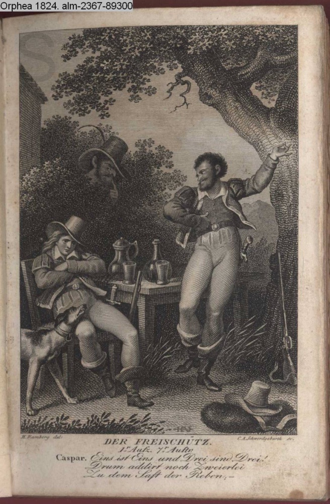 DER FREISCHÜTZ. / 1r. Aufz. 7r. Auftr. / Caspar. Eins ist Eins und Drei sind Drei! / Drum addirt noch Zweierlei / Zu dem Saft der Reben