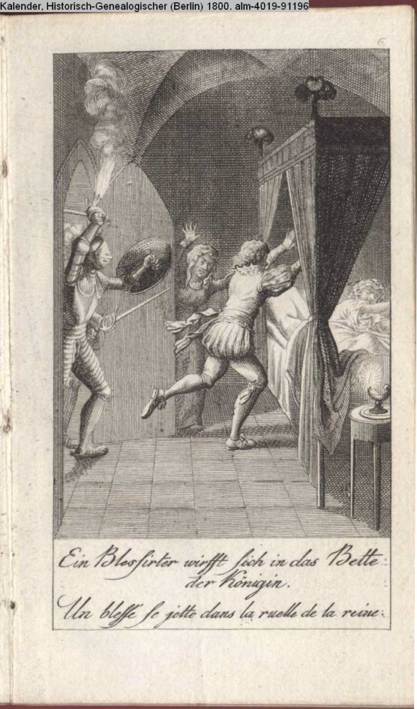 Ein Blessirter wirft sich in das Bette / der Königin. / Un blessé se jette dans la ruelle de la reine