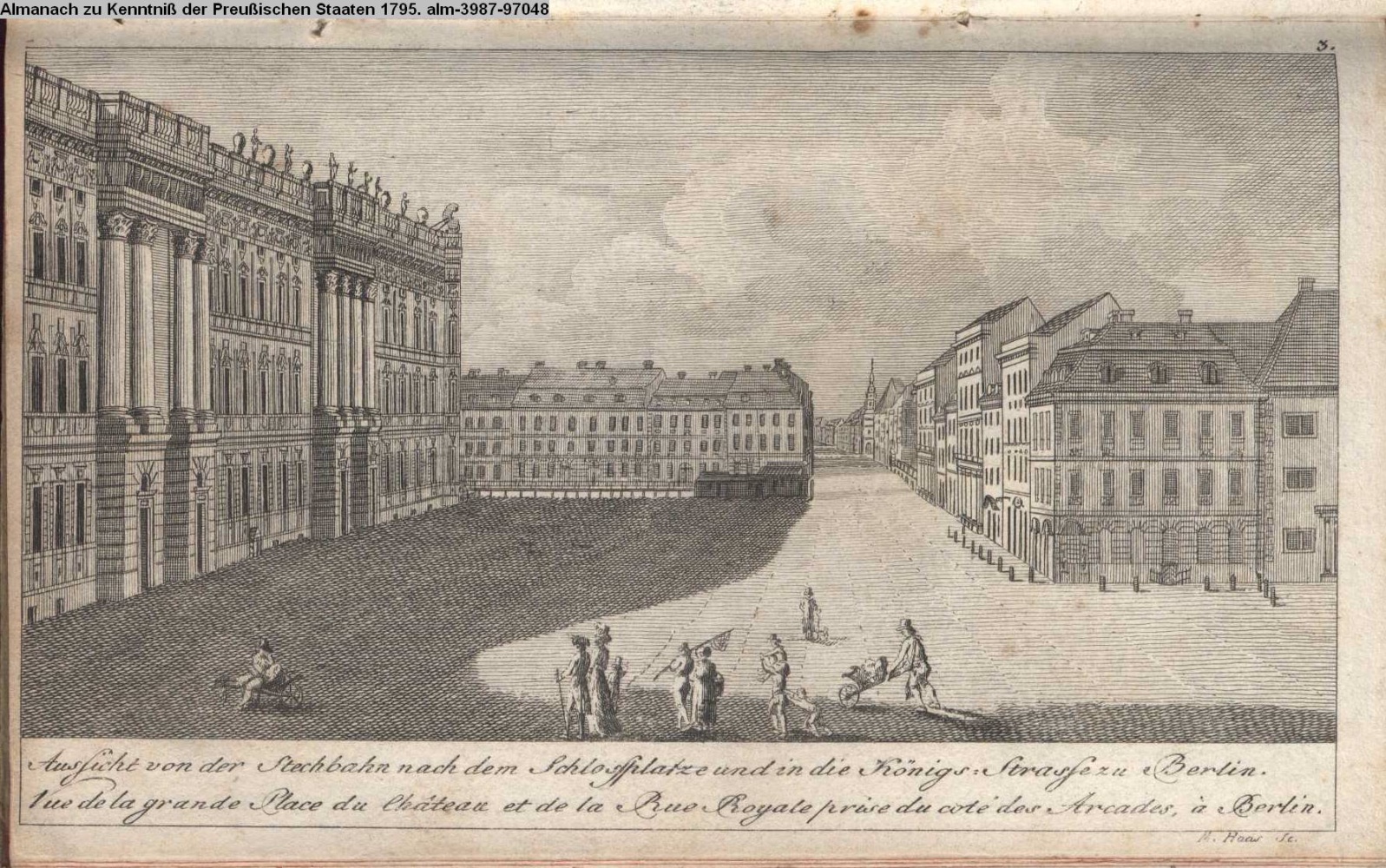 Aussicht von der Stechbahn nach dem Schlossplatze und in die Königs-Strasse zu Berlin. / Vue de la grande Place du Château et de la Rue Royale prise du coté des Arcades, à Berlin