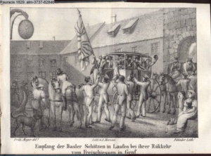Illustration zu »Der Basler Reise zum Freischiessen in Genf, der Aufenthalt daselbst und ihre Rückkehr nach Hause, im Sommer 1828. Der verehrten Feuerschützengesellschaft in Basel gewidmet«