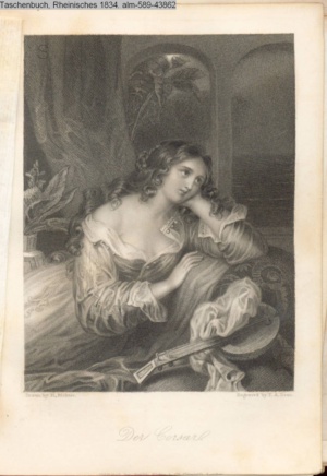 [unter der Graphik: Stich & Druck durch Kunst-Verlag in Carlsruhe]. Illustration zu »Die Braut von Abydos« von George Gordon Byron s. Textbezug INr 43859, Obj 5