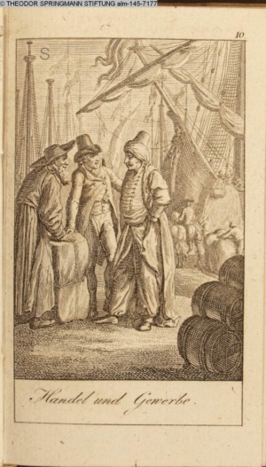 Illustration zu »Einige Denkmahle des Edelmuths und der Tapferkeit aus dem jetzigen Kriege wider die Türken / 3. Joseph der Zweyte, befreyet die Türkischen Kaufleute von ihrem Gefängniß in Fiume« INr 75608, Obj 33