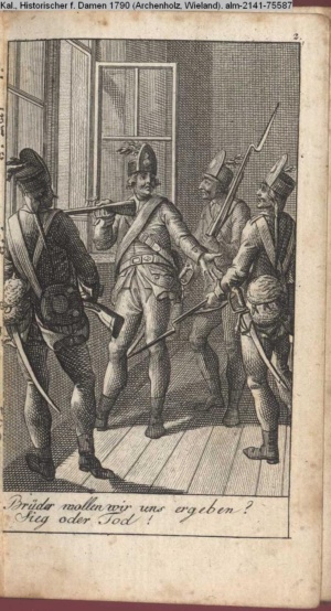 Illustration zu »Einige Denkmahle des Edelmuths und der Tapferkeit aus dem jetzigen Kriege wider die Türken / 2. Großer Muth einiger Oesterreichischen Soldaten« INr 75607, Obj 32