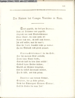 Seyd gegrüßt, ihr heil'gen Trümmer, / Auch als Trümmer mir gegrüßt, / Obgleich nur noch Mondesschimmer / Einer Sonn', die nicht mehr ist!…