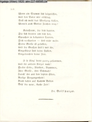 Anm. d. Hrsg. am Objekt: Dieses zur Jubelfeier des Erzherzog's Carl, als Großkreuz des milit. Maria-Theresien-Ordens, am 5. April 1843 verfaßte Gedicht wurde damahls von der Censur zum Druck nicht zugelassen. [...]