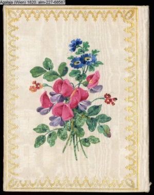 Umschlagschmuck v. Seideneinband mit Goldbordüre und koloriertem bouquet