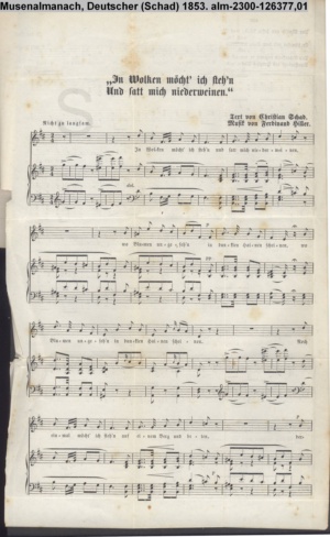 In Wolken möcht' ich steh'n / Und satt mich niederweinen / Text von Chistian Schad. / Musik von Ferdinand Hiller