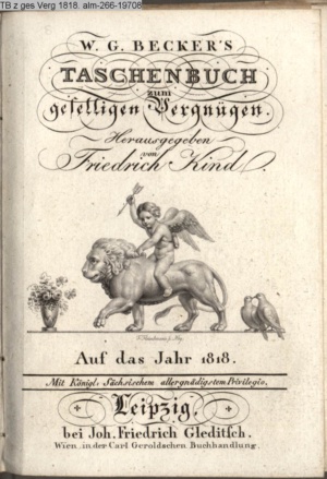 W. G. BECKER'S / TASCHENBUCH / zum / geselligen Vergnügen. / Herausgegeben / von / Friedrich Kind. / Auf das Jahr 1818. / Mit Königl. Sächsischem allergnädigstem Privilegio. / Leipzig, / bei Joh. Friedrich Gleditsch. / Wien in der Carl Geroldschen Buchhandlung