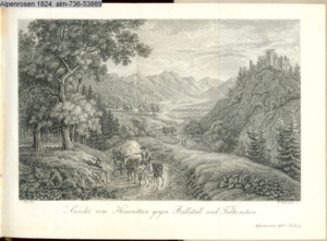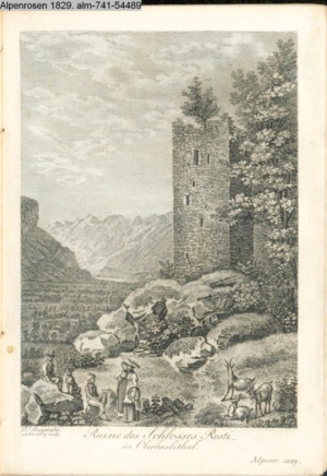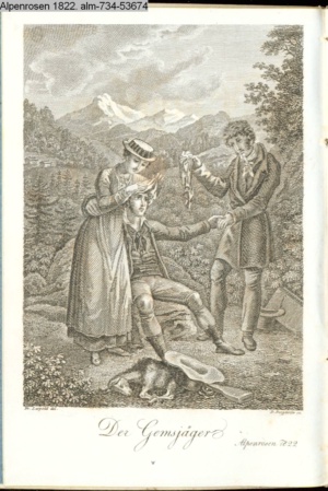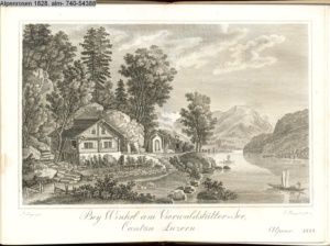Anmerkung am bez. Text : Die hier beygefügte Ansicht, von der Hand einer geschätzten Künstlerinn gezeichnet, macht das Gegenstück zu der Ansicht im Jahrgange 1824, Seite 341 der Alprosen. Dort ist die Ferne südöstlich, hier südwestlich genommen [...] s. Graphik »Neuenstadt am Bieler-See im Canton Bern« in: Alpenrosen 1824; INr 53925