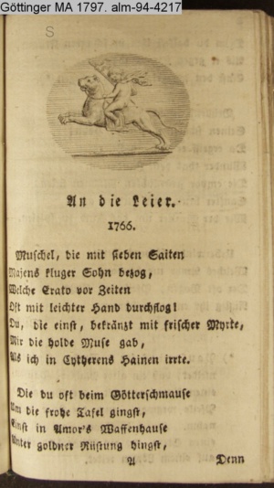 Ode an Seine Königliche Hoheit, / Friedrich, Herzog von York und Fürst- / Bischof von Osnabrück u. w. / Bei Höchstdero Anwesenheit in Göt- / tingen am 18. Sept. 1786 übereicht / von den daselbst Studirenden