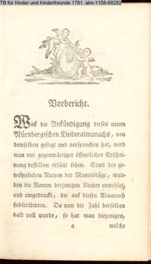 Was die Ankündigung dieses neuen Nürnbergischen Kindelalmanachs, von demselben gesagt und versprochen hat, wird man mit gegenwärtiger öffentlicher Erscheinung desselben erfüllt sehen.…