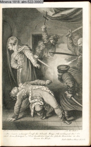 Die Czarin schweigt? ruft die tobende Menge, Sie verläugnet ihn? So / stirb denn, Betrüger! - Und durchbohrt liegt der falsche Demetrius zu den / Füßen der Marfa. / Nach Schillers Skizze S. 368