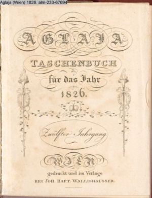 AGLAJA. / Ein Taschenbuch / FÜR DAS JAHR / 1826 / Zwölfter Jahrgang. / WIEN, / gedruckt und im Verlage / BEI JOH. BAP. WALLISHAUSSER