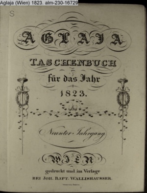 AGLAJA. / Ein Taschenbuch / FÜR DAS JAHR / 1823 / Neunter Jahrgang. / WIEN, / gedruckt und im Verlage / BEI JOH. BAPT. WALLISHAUSSER