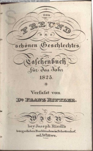 DER / FREUND / DES / schönen Geschlechtes / Taschenbuch / für das Jahr / 1825. / Verfasst / von / DR. FRANZ RITTLER. / WIEN. / bey Jos. Riedl's bürgerl. Buchbinder im Schottenhof, / sel. Wittwe
