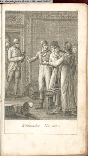 # Bezeichnung am ersten Blatt der Suite. Graphik im Kalendarium paginiert 5. Illustration zu »Manfred, Karl von Anjou und Konradin von Hohenstaufen«