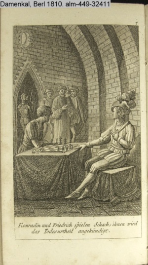 Konradin und Friedrich spielen Schach, ihnen wird / das Todesurtheil angekündigt