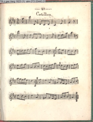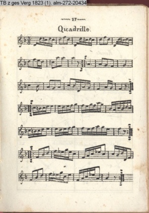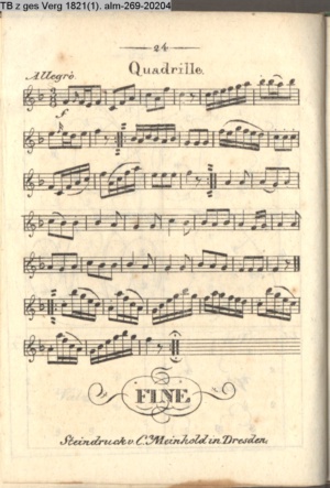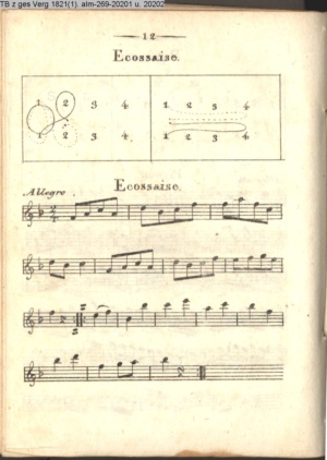 Tänze mit Musik Contredanses, Quadrille, Cotillon und Ecossaise, welche bei Hofe getanzt werden nebst Musik zu einem neuen Walzer herausgegeben von Herrn Lauchery Königl. Balletmeister und Solo-Tänzer in Berlin (Sammlung INr 20421, Obj 88) (Photos 20437,01-20437,04)