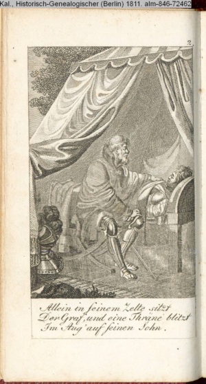 Allein in seinem Zelte sitzt / Der Graf, und eine Thräne blitzt / Im Aug' auf seinen Sohn