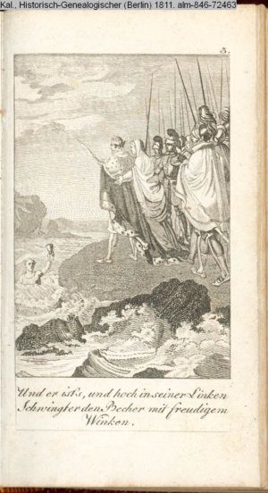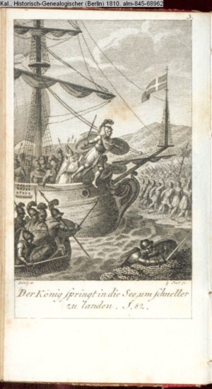 Der König springt in die See, um schneller / zu landen. S. 82.