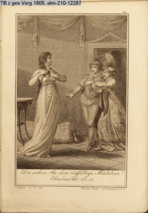Illustration zu »Alte Zeit und neue Zeit. Ein Fragment aus den nachgelassenen Papieren der verwitweten Frau Ursula Margaretha« von Karl Friedrich Kretschmann in: Taschenbuch zum geselligen Vergnügen 1805 INr 12336
